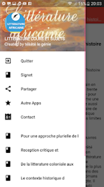 "Littérature Africaine" to aplikacja edukacyjna dostępna na platformie Android, która przybliża użytkownikom bogactwo literackie Afryki. Program skupia się na historii literatury, zaczynając od starożytnych tekstów egipskich, aż po współczesne dzieła. Użytkownicy mogą odkrywać różnorodne gatunki literackie, w tym epiki, legendy oraz tradycyjne opowieści, które odzwierciedlają bogatą tradycję oralną kontynentu. Aplikacja dostarcza także informacji na temat pisarzy i ich wpływu na literaturę afrykańską w XX wieku.